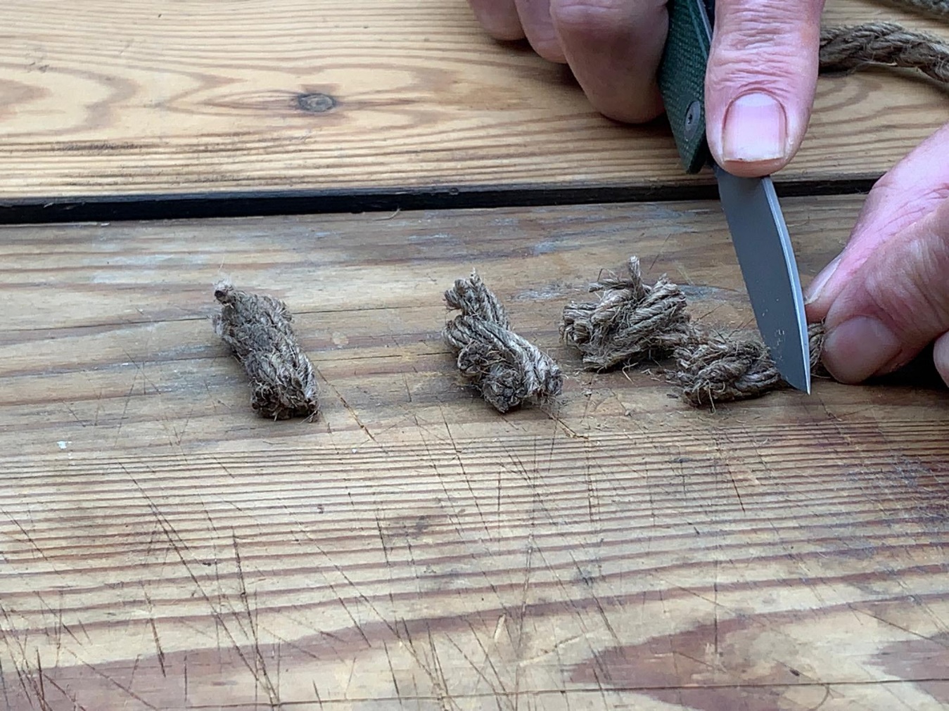HET TOUW DOORSNIJDEN: Zeer goed/. (stukjes zijn ook als vuurstarter te gebruiken).