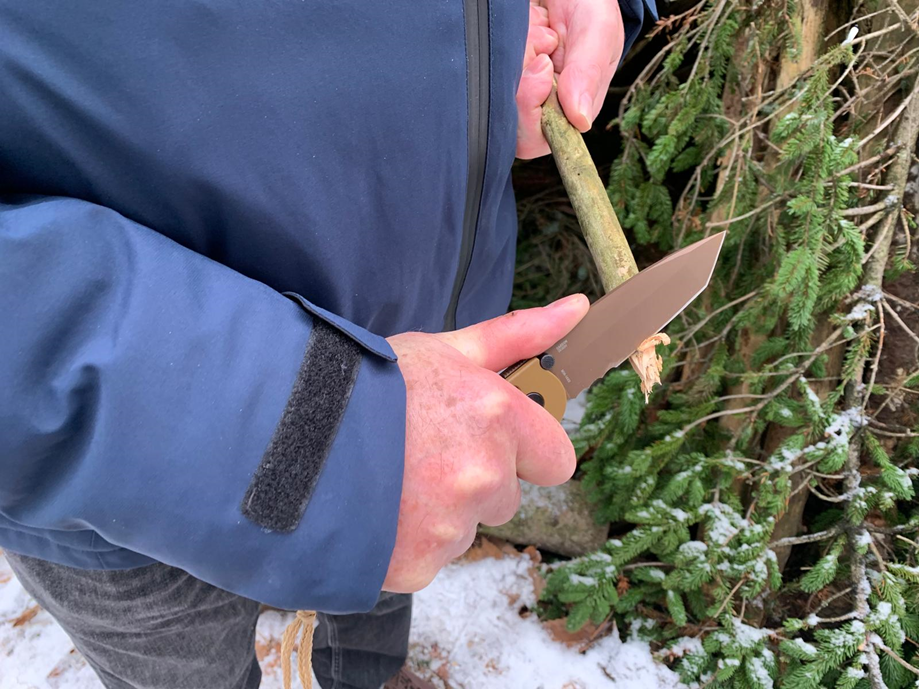 Het inklappen van het geopende lemmet gebeurt door met je duim deze onder veerdruk staande duimknop en vergrendel-as terug naar achteren/rechts te trekken, hierdoor wordt het lemmet ontgrendeld en kun je het lemmet veilig sluiten. Hierna beweegt zich de vergrendel-as wederom naar links en wordt daardoor het gesloten lemmet gefixeerd. Die fixatie mag wat mij betreft wel strakker zijn.