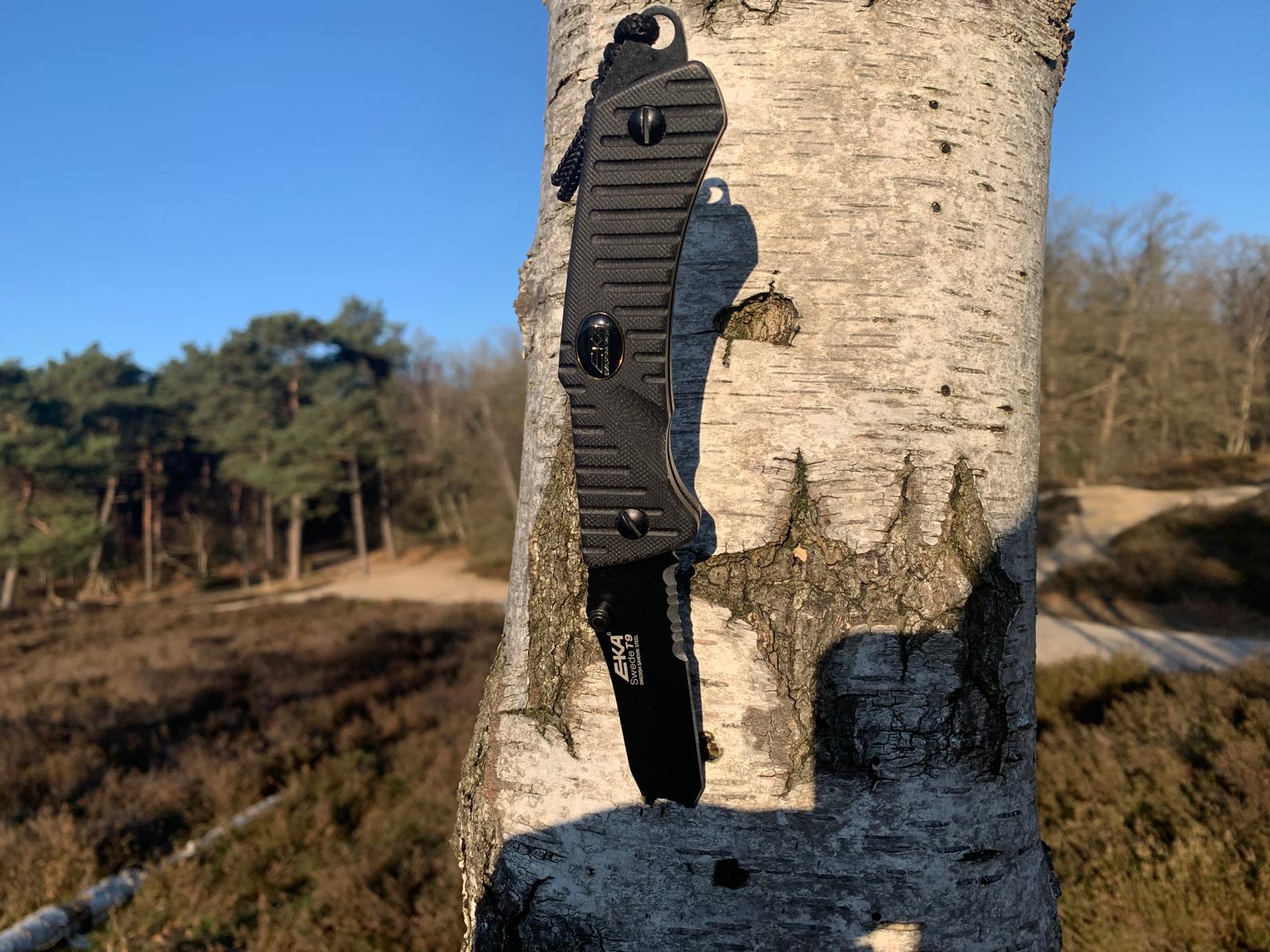 Als je als militair in ergens het veld zit, is dit grote scherpe EKA-vouwmes een echte BUDDY en je mogelijke levensredder! Ondanks dat de kledingklip zeer goed klemt, zou ik hem echter wel bij “het rossen door de bossen” in een goed tactisch M.O.L.L.E foedraal dragen (of in mijn ontworpen flexibel inzetbare HKD-designed pouch) of zeker hem met het meegeleverde EKA-koord of een stukje parakoord tegen verlies van je Buddy/mogelijke levensredder!