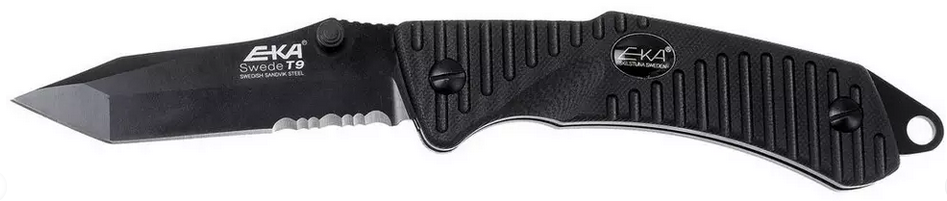 De Swede T9 Black van EKA1882 AB is een robuust tactisch vouwmes met dubbele duimknoppen voor een snelle eenhandige opening (rechts zowel links) van het grote, zeer scherpe en gedeeltelijk gekartelde Amerikaans Tantovormige lemmet, met aan de achterkant een uniek gepatenteerd vergrendelingsmechanisme met driehoekig eindstuk met een polsriemoog (voor een stevige grip), die zorg draagt voor een solide & veilige vergrendeling en snelle ontgrendeling van het grote lemmet. Maar dat driehoekig eindstuk kan met gesloten lemmet echter in een noodgeval als ruitentikker of in een militair hand gemeen ook als “Last Ditch Skullduster” dienen. Het tactisch vouwmes is dankzij de dubbel aangebrachte duimknoppen op het lemmet en het achteraan te bedienen unieke (Back/Rear Lock) vergrendelings-mechanisme voor rechtshandige als ook linkshandige gebruikers zeer geschikt en ook met koude vingers of Mil. Spec. handschoenen aan, erg goed te gebruiken.