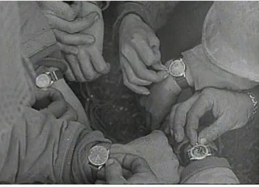 5. HET HACKEN/STILZETTEN SECONDEWIJZER UURWERK: Uitmuntend goed/. Het Zwitserse RONDA 515 Quartz uurwerk van de KHS SHOOTER MKII is van een zeer goede kwaliteit en bezit dus ook de belangrijke hackfunctie (= gelijkzetfunctie), dit speciaal om de synchronisatie met het tijdsein, computer of het gelijkzetten met de horloges van andere teamleden mogelijk te maken. Zeer belangrijk, niet voor niets bestaat het gezegde ”met militaire precisie”. Zelf vind ik dat de “jeugd” tegenwoordig wat te gemakkelijk te laat komt, mogelijk doordat ze veelal geen horloges en wel smartphones dragen. Over hun discipline zal ik het hier maar niet hebben. PROCEDURE HACKEN. Van tevoren dient u de schroefkroon los te draaien. Als de secondewijzer bijna op de 12 is, trekt u om te kunnen hacken de grote schroefkroon voorzichtig geheel/ naar stand 2” uit, waardoor het uurwerk en de secondewijzer stopt. Na het tijdsein op de computer of tijdsein van het nieuws e.d. dient u de schroefkroon onder lichte druk weer in te drukken. Hierdoor zal het uurwerk en de secondewijzer weer beginnen te lopen. Hierna kunt u de schroefkroon weer geheel indrukken en vinger vastdraaien. Ik heb het horloge overigens aan het begin van de testen met de interne computerklok gelijkgezet.