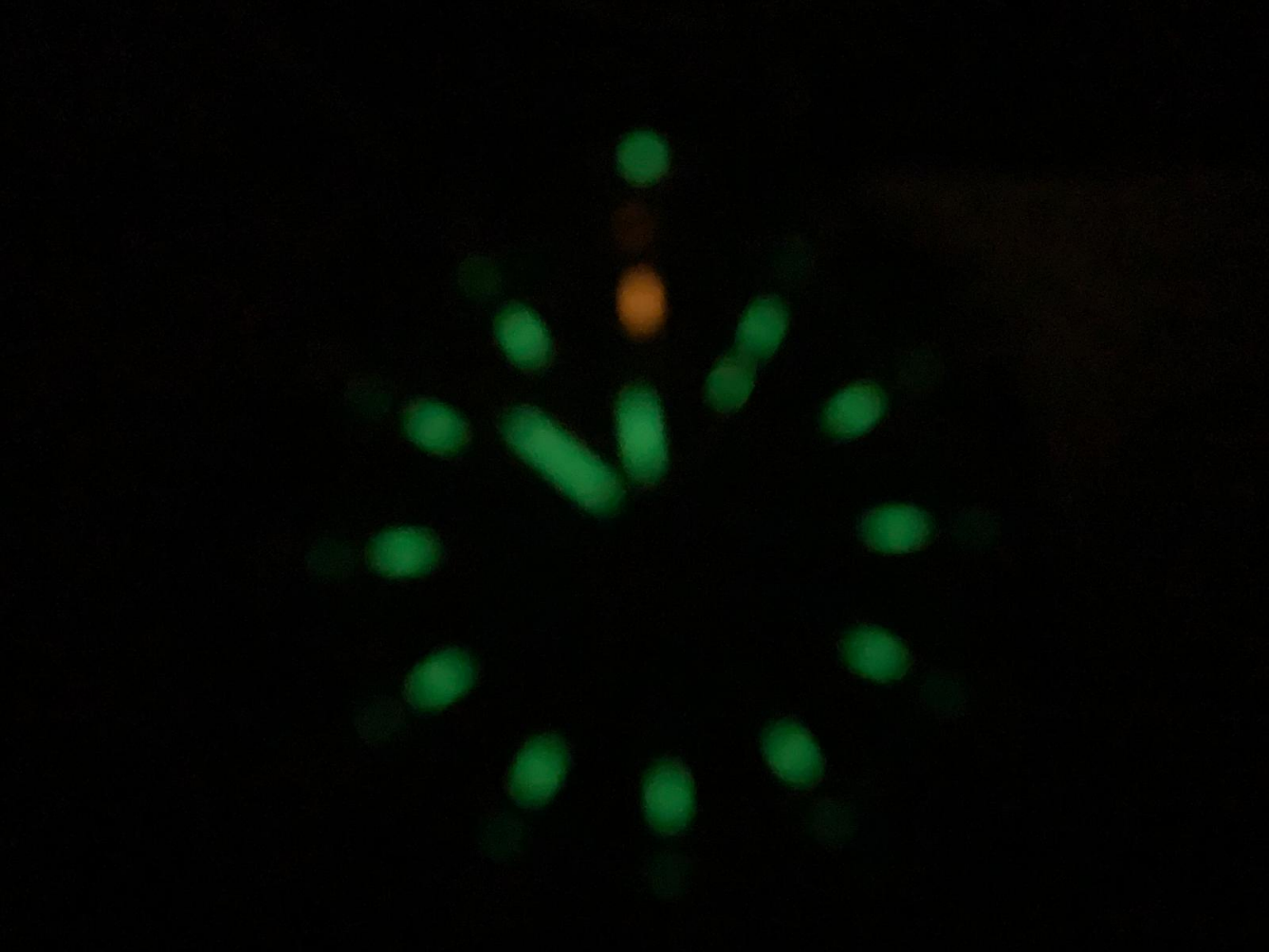7. GOEDE AFLEESBAARHEID TIJDENS DUISTERNIS: Zeer goed/. Zeer goede afleesbaarheid voor de juiste tijd is een must, maar het licht van de wijzerplaat mag bij duisternis ook niet TE fel zijn, waardoor u te zien bent. En hierbij de onderstaande foto midden in de nacht van de KHS SHOOTER MKII.