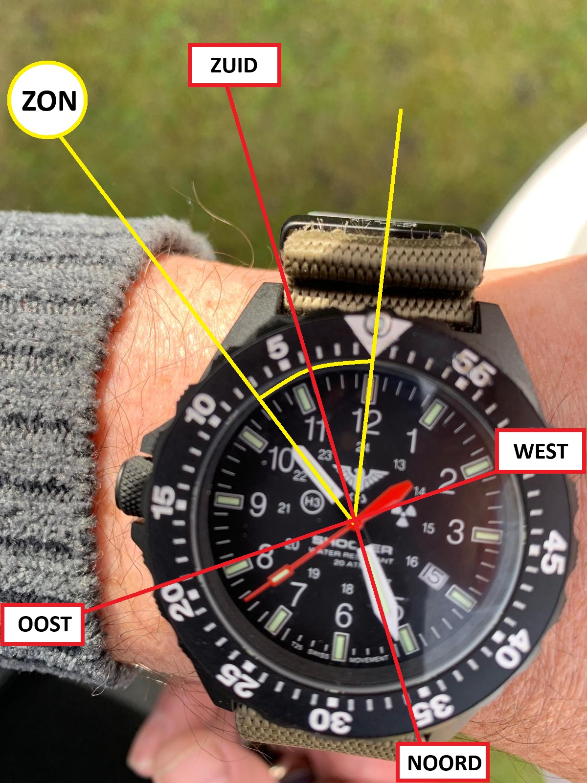 13. GESCHIKT ALS ZONNEKOMPAS (TER RUWE) NOODNAVIGATIE OP HET NOORDELIJKE HALFROND: Zeer goed/. Dus moet het daarvoor een horloge met duikers of GMT-draairing met uren en minuten verdeling hebben. Ik heb daarover belangrijk praktijkvoorbeelden! Dus als zonnekompas bij het navigeren m.b.v. uw analoge horloge en de horizontale klokmethode op dit Noordelijke Halfrond en dat in samenwerking met de zichtbare zon. Het is dus mogelijk om op het Noordelijke Halfrond het globale noorden te bepalen met behulp van uw analoge KHS SHOOTER II horloge met zijn Countdown draairing en de zichtbare zon. In het echt dient u het horloge horizontaal te houden. Bij deze methode maken we ook verschil tussen de zomer en wintertijd! Opmerking 1: Richt hierbij wel op de zichtbare zon en niet bij een bewolkte hemel op de plaats waar de zonnestralen uit de wolken vandaan komen. Door reflectie van/via de wolken kan het zijn dat de zon ergens anders staat en dan gaat u in de fout. Is mij een keer overkomen toen ik ook nog flink onderkoeld was, maar gelukkig herstelde ik mezelf vrij snel, wat mij vele kilometers verkeerd lopen gescheeld heeft. A. PROCEDURE HORIZONTALE KLOKMETHODE (TIJDENS DE WINTERTIJD). - Richt de kleine uurwijzer op de zon; - Precies het middelste punt tussen de kleine wijzer en de 12 op de wijzerplaat is het Zuiden. Opmerking 2: Tijdens de Zomertijd is het Zuiden het middelste punt tussen de kleine wijzer en de 1. Verder is de procedure hetzelfde! - Vanaf het Zuiden dient u recht over de as van de wijzers een denkbeeldige lijn te trekken, daar is het Noorden. Daarna kunt u haaks op de Zuid /Noord as de andere kompasstanden West en Oost uitzetten. AFBEELDING KHS SHOOTER II ALS ZONNENKOMPAS (TIJDENS DE WINTERTIJD).