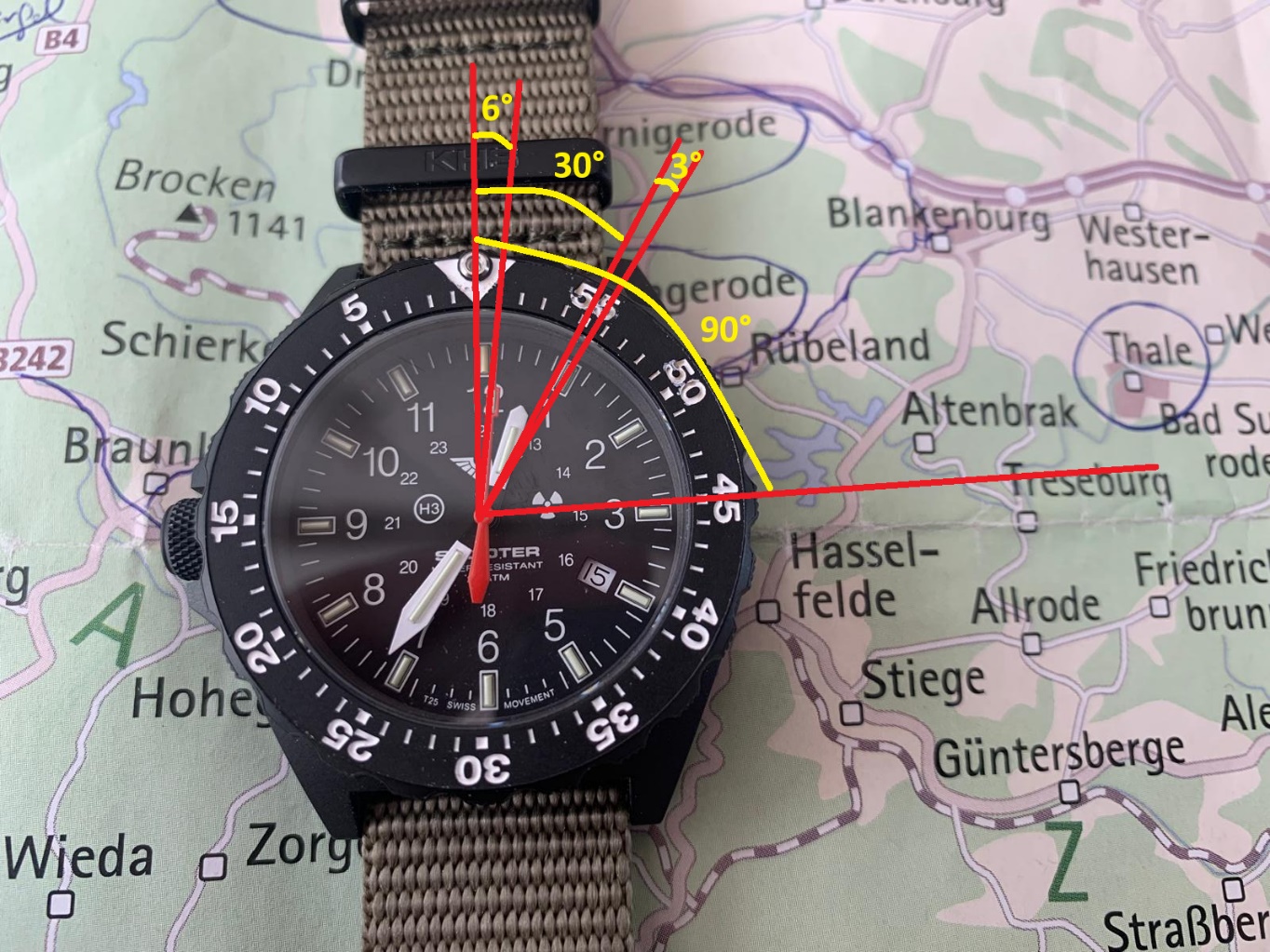 MKII. b. Dat betekent dan verder dat er tussen de nul-marker/het lichtgevende rondje van de Countdown draairing en de 50 minuten aanduiding, een hoek van zestig graden is. c. En dat er tussen de nul-marker/het lichtgevende rondje van de Countdown draairing en 55 minuten aanduiding, een hoek van dertig graden zit. d. Dat betekent verder dus dat elke minutenstreep (30 gedeeld door 5) een hoek maakt van zes graden. Met een beetje ervaring kun je nu een minutenstreep verdelen in de helft en kun je dus een ruwe hoek van drie graden uitzetten, zie daarvoor ook de bovenstaande afbeelding. Veel succes!