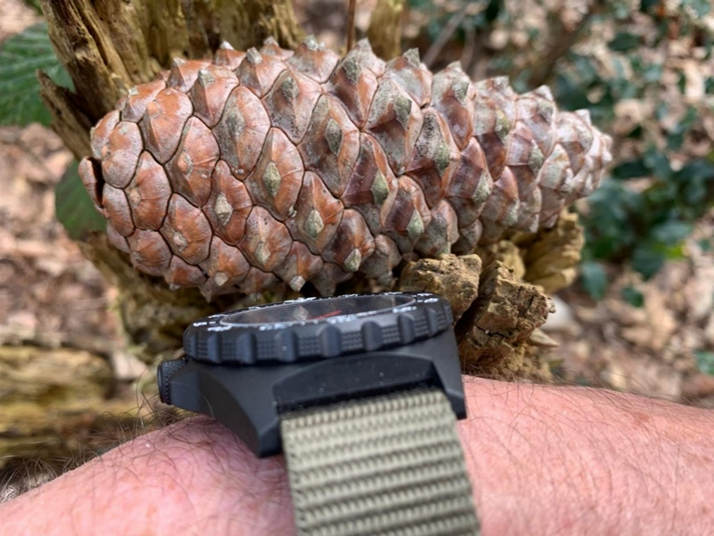 OM DE POLS TIJDENS DE SCHERPTETEST VAN DE VOSTEED RACCOON 2.0. Het horloge zit dankzij de grootte, de vorm en de NATO-band Uitmuntend goed/ aan mijn pols.