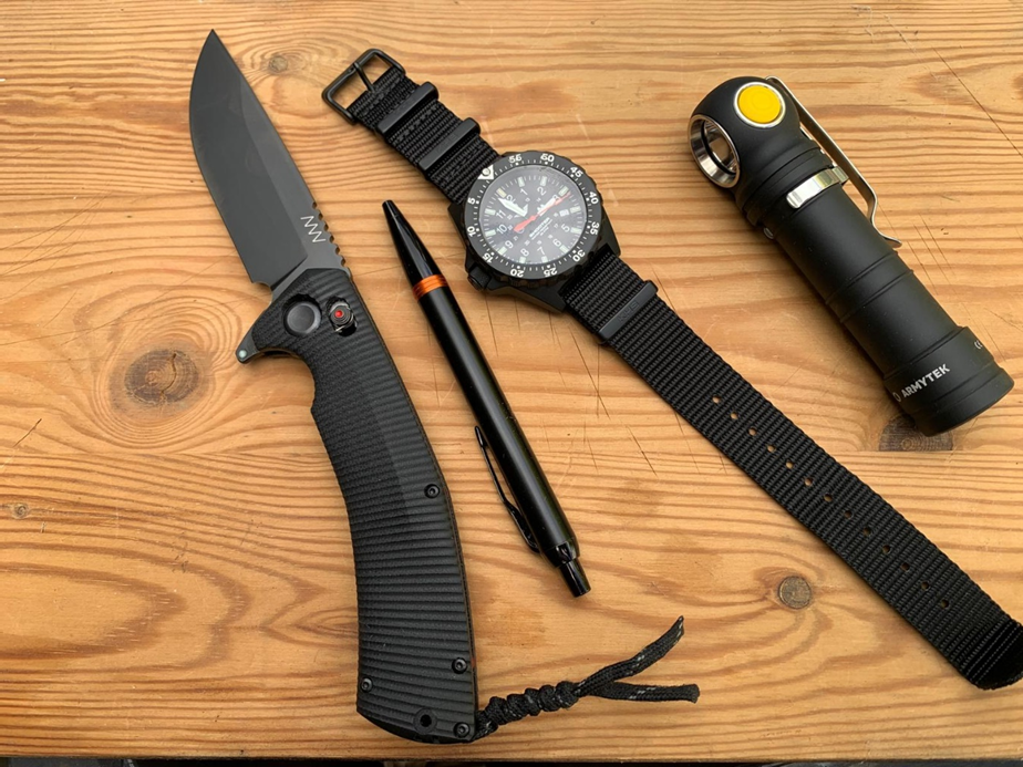 V.L.N.R: het ANV A400 BB vouwmes; de Parker IM Vibrant Rings balpen; de KHS SHOOTER MKII en de Armytek C2 Pro Max LR PCB White Light “hoofdlamp”. |