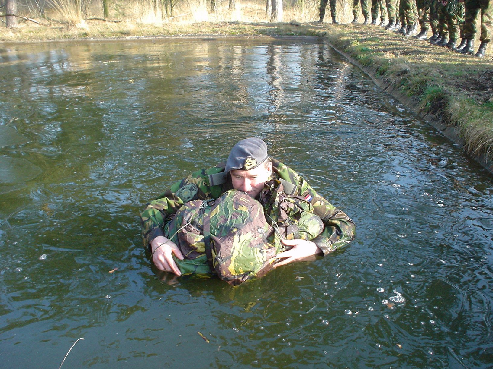 WO-I/CHIEF HENK “THE KNIFE” DEMONSTRATING HIS FLOATING PACK INTO ICE WATER.