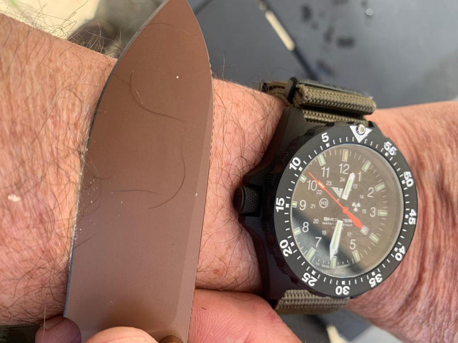 6. IN EEN OOGOPSLAG GOEDE AFLEESBAARHEID OVERDAG: Zeer goed/. De wijzerplaat van de KHS SHOOTER MKII heeft duidelijke indexen voor de uren en minuten en ook Arabische cijfers. Bij MIJN veldtesten droeg ik het horloge normaal aan de mijn pols. Wel mag het saffierglas voor de betere afleesbaarheid van de wijzerplaat meer ontspiegeld zijn. |
