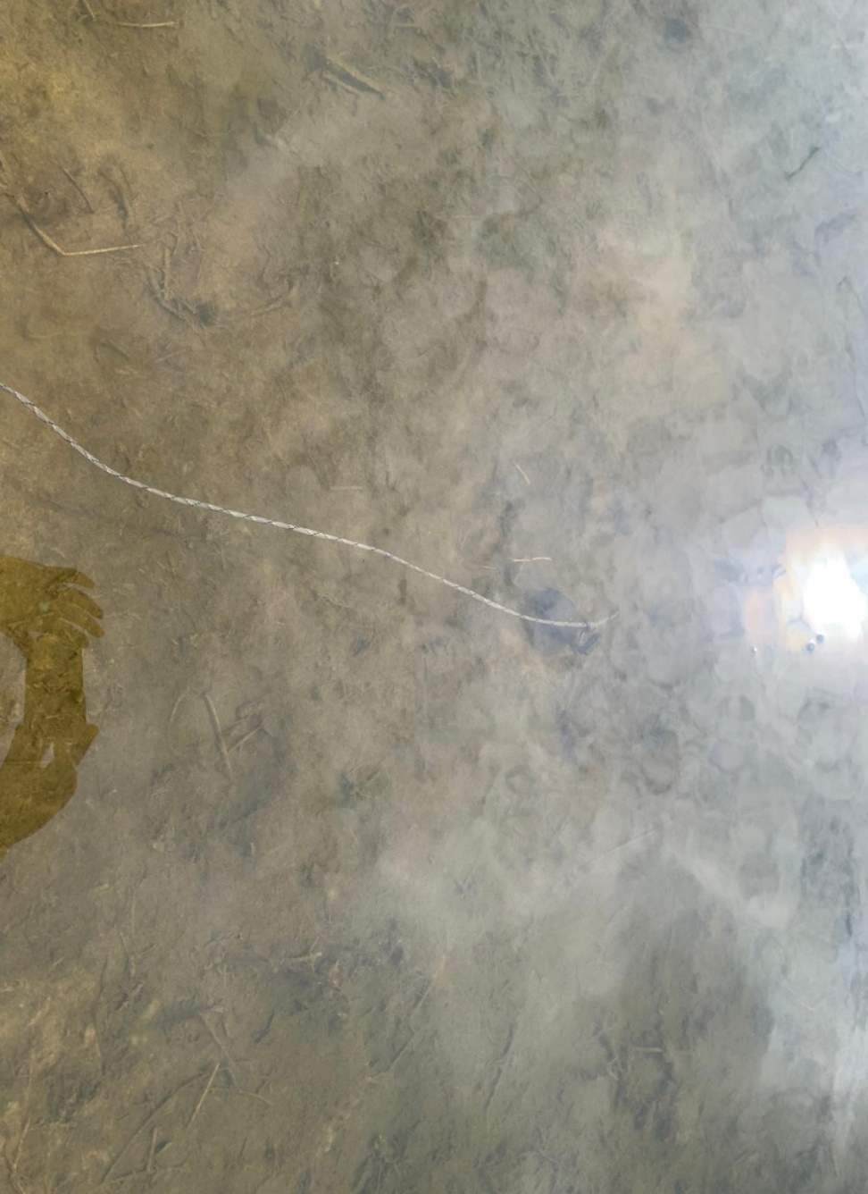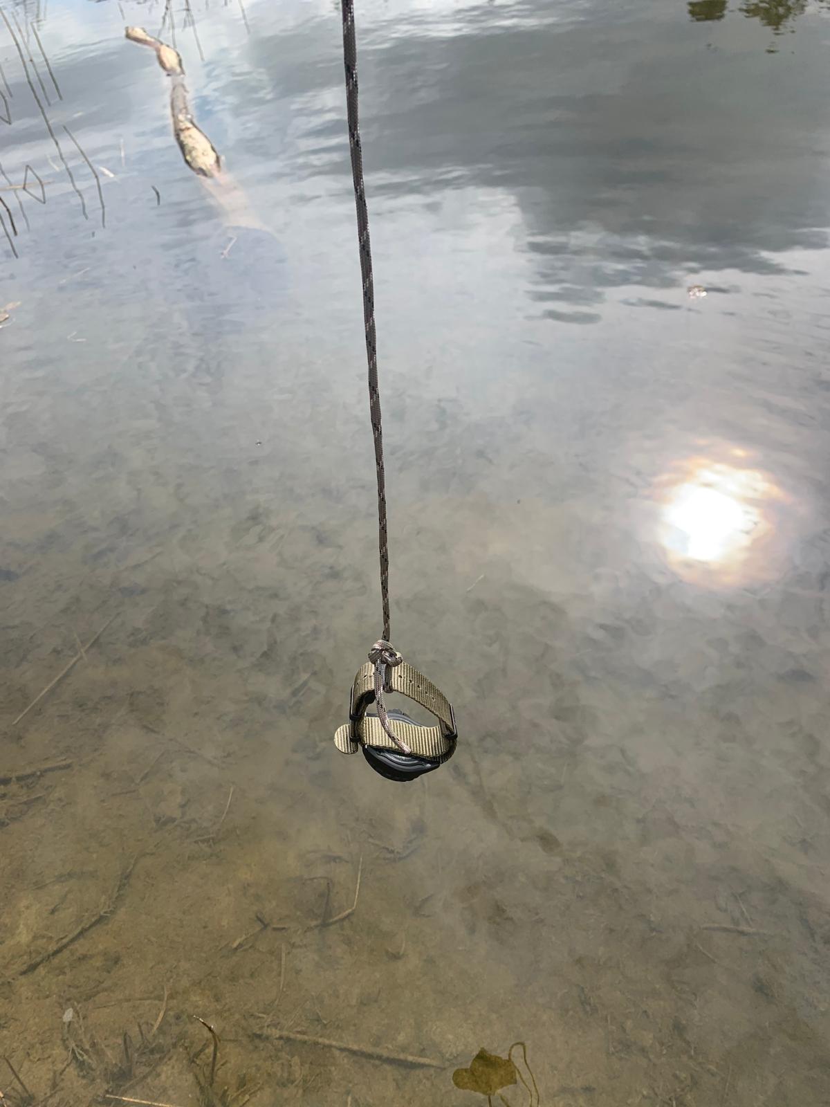 B. MOEILIJK TE ZIEN, MAAR HORLOGE IS IN HET MEERTJE GEGOOID EN EEN DIK UURTJE ONDERGEDOMPELD EN VASTGEBONDEN AAN HET PARAKOORD GELEGEN.