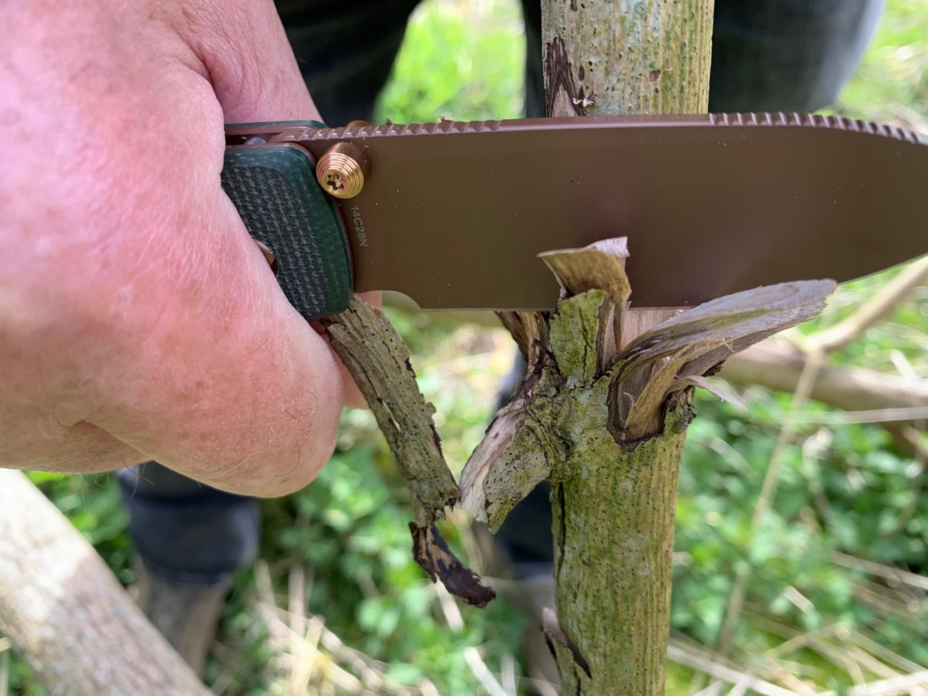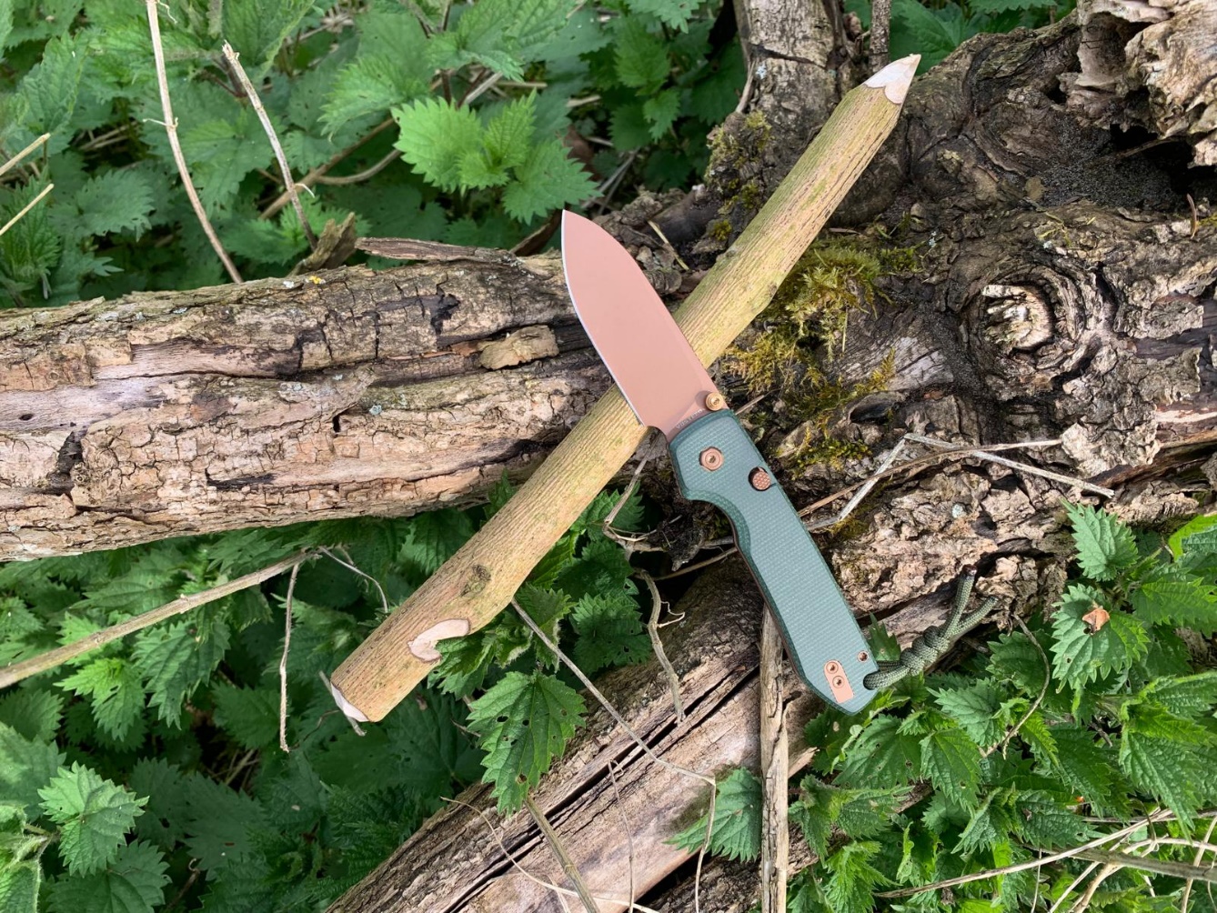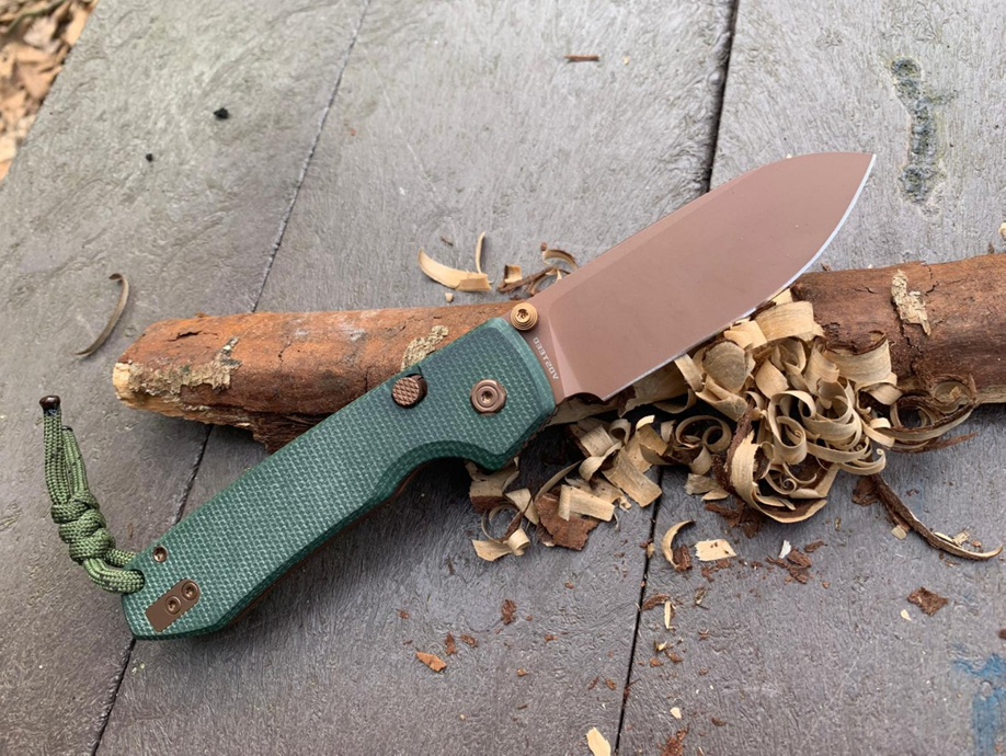 DE HANDGREEP: De handgreep bestaat uit de twee groene Micarta greep platen, die met behulp van Torx-schroefjes op de duinkoperkleurige roestvaste montageplaten/Liners zijn geschroefd. Tussen deze montageplaten/Liners zit de achterkant de rose goudkleurig geribbeld aluminium achter tussenstuk/Backspacer en de handgreep is voor een betere lemmetsturing aan de voor/ onderkant van ribbels/Jimping voorzien. De linker greep plaat herbergt Top Liner lock vergrendelsysteem en een afdekplaatje van de kledingclip. De handgreep heeft om verlies te voorkomen een oog voor een parakoord polsriem.