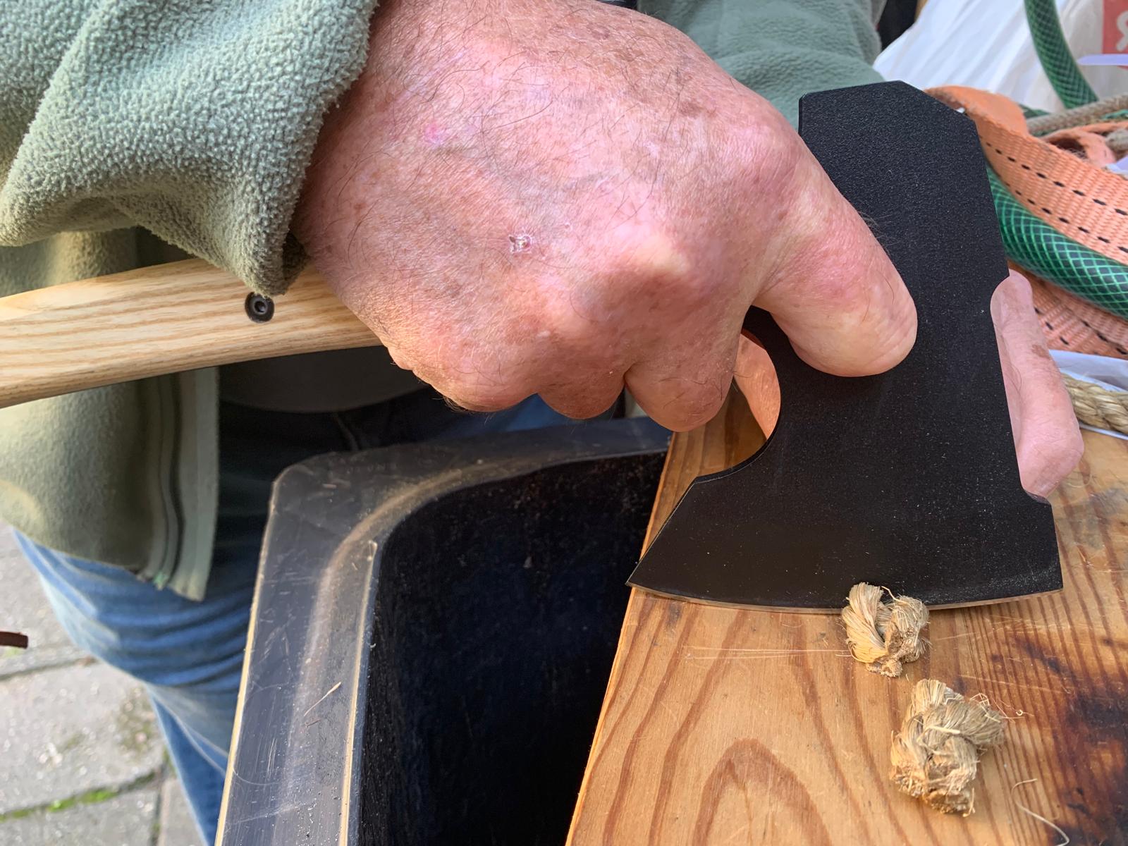 grip bij het hakken, zowel aan het begin van de bijlsteel als aan het