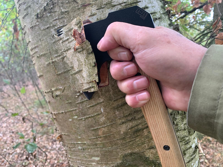 - Ga bij het in stukken willen hakken van een al omgehakte of gewaaide horizontaal liggende boom niet op deze mogelijk wegrollende boom staan en daardoor bij het hakken uw evenwicht verliest en dan in uw tenen/benen hakt of erger in uw bijl kop valt. Maar nu terug naar de kern van het verhaal de ZA-PAS Hatchet.