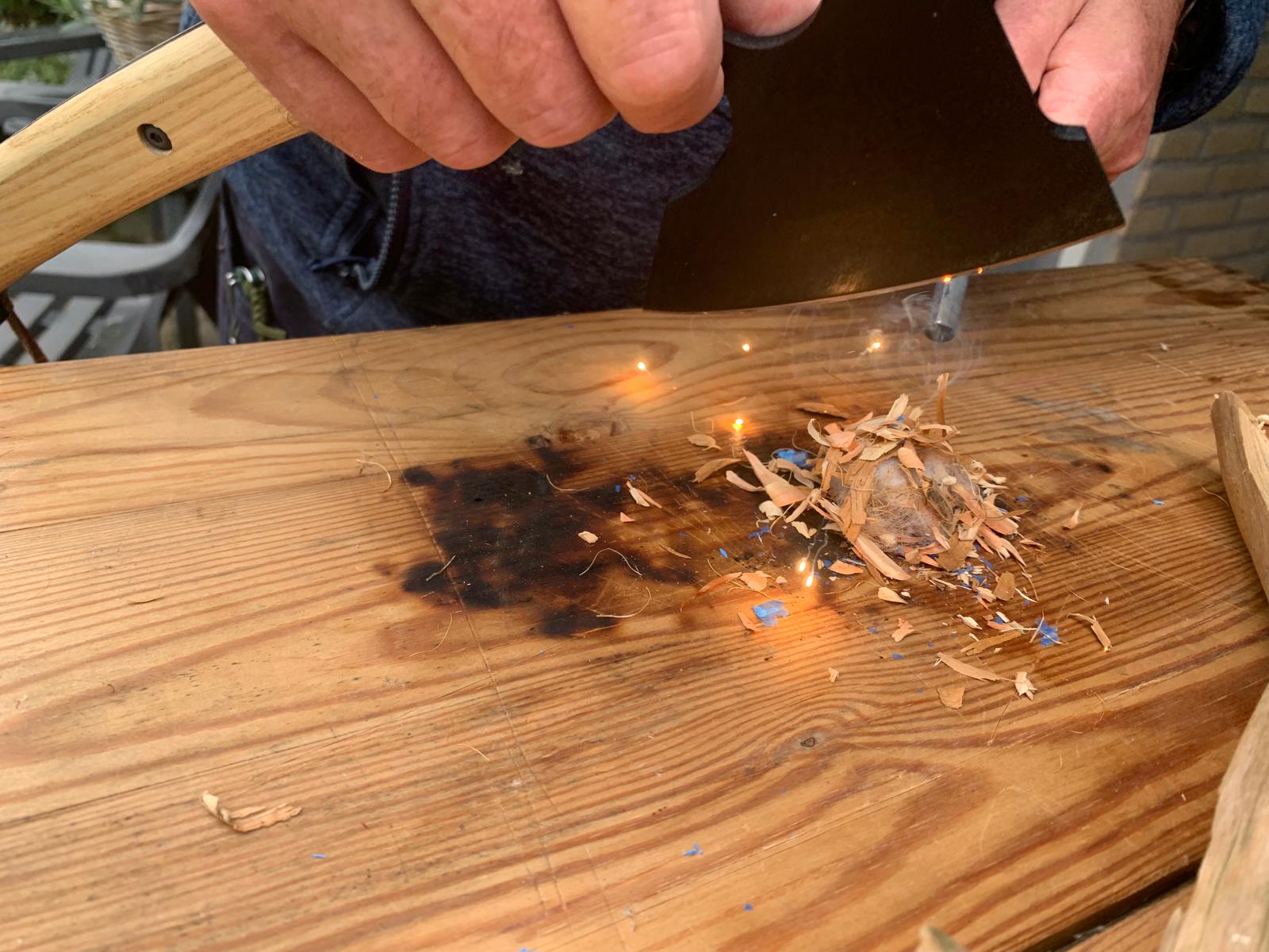 VUUR ONTSTEKEN MET DE BIJLSNEDE, ZONDER DEZE TE BESCHADIGEN: Zeer goed/. |